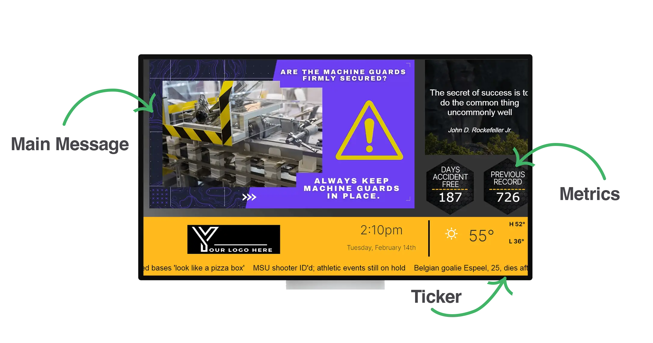From lobbies, break rooms, meeting spaces, production areas and time clocks, use digital signage to broadcast up-to-date company news, safety announcements and other relevant information to all of your employees.