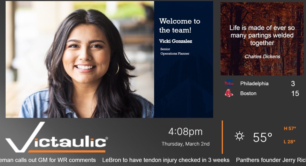With our corporate digital signage software, you can keep your employees engaged with eye-catching graphics and content such as team success stories and achievements, upcoming special events, birthdays, work anniversaries and even inspirational quotes.
